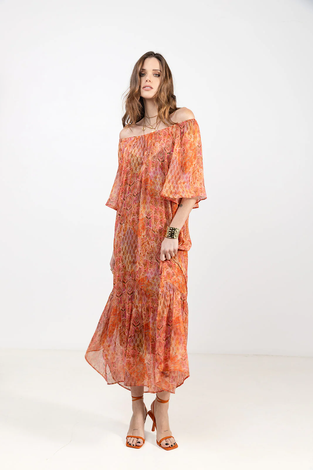 Cette robe longue à l’imprimé rose bohème incarne l’élégance estivale chère à Elora. Sa coupe fluide et sa longueur cheville offrent un tombé aérien, idéal pour accompagner les beaux jours avec légèreté. L’encolure élastiquée permet de la porter sur les épaules ou légèrement dégagée, selon l’envie, tandis que les manches papillon et le bas volanté apportent du mouvement. Doublée pour plus de confort, elle révèle une silhouette féminine et lumineuse, parfaite pour un style chic et solaire.